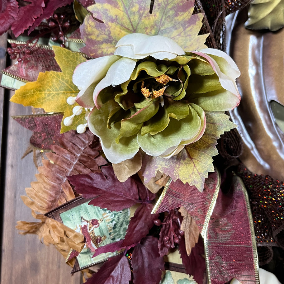 Do you have a rustic space or wine bar that needs a fall décor piece, how about this wreath? Full of texture and layered with colors, merlot, tan, brown, greens and cream. Florals and greenery include: peonies, maple leaves, oak leaves, ferns, berries and pumpkins, it's gorgeous. Note the rustic outdoor themed ribbon with a couple canoeing, wine colored berries and a turtle. It also has a gold-edged merlot colored ribbon with bunches of grapes printed on it, so pretty.