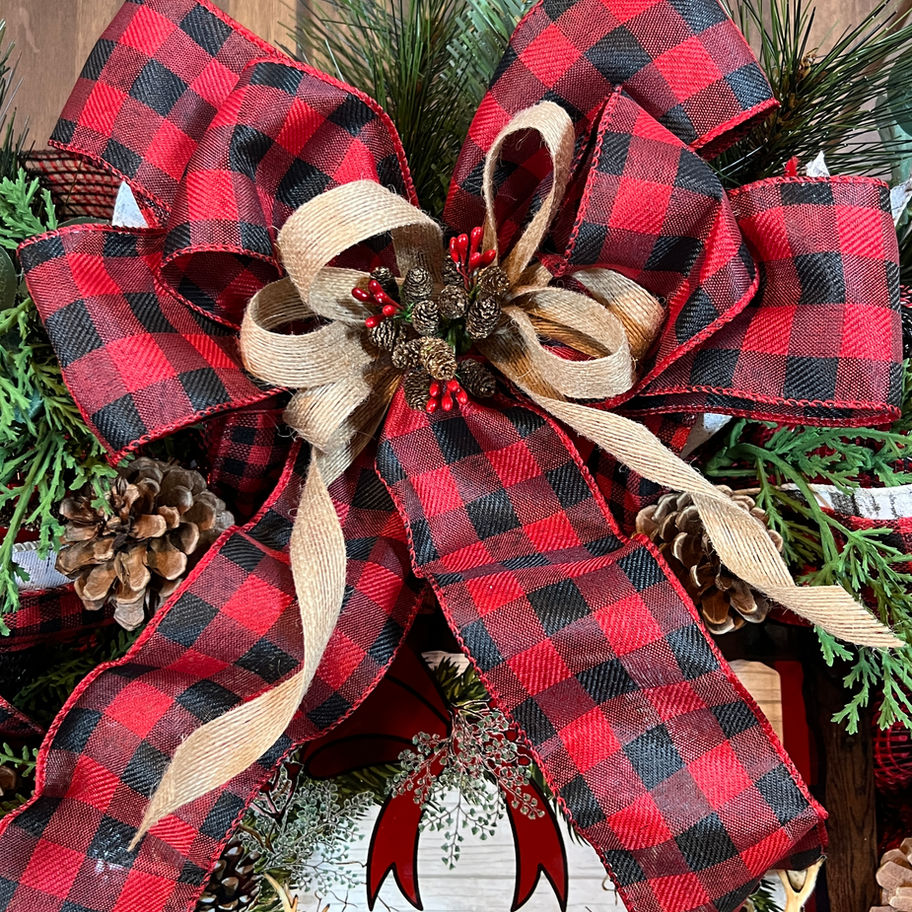 | A rustic season's greetings wreath to cozy up your space. The wreath is on a red and black buffalo plaid mesh base. Greenery includes realistic looking eucalyptus, pine, cedar and ferns. Ribbons include: red velvet touch, red & black buffalo plaid & faux birch bark, the pine cone accents are real. The bow is made of buffalo plaid and burlap ribbon with a mini pine cone and berry accent. The metal moose seasons's greetings sign has a red and black buffalo check border on a wood look background, the detail is a little hard to see in the picture. |